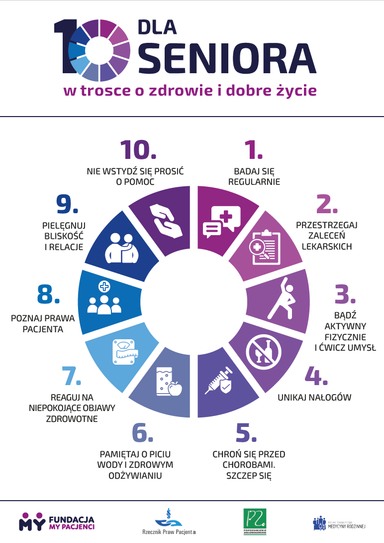 W obliczu starzenia się społeczeństwa – już dziś osoby po 60. roku życia stanowią ponad 25 proc. Polaków – zdrowie i aktywność seniorów stają się jednym z najważniejszych wyzwań zdrowia publicznego. Dlatego Fundacja MY Pacjenci przygotowała „10-tkę dla Seniora” – projekt, który w przystępny i atrakcyjny sposób przypomina o podstawowych zasadach profilaktyki. Celem jest nie tylko promowanie zdrowego stylu życia, ale również wspieranie idei świadomego i aktywnego uczestnictwa pacjentów w opiece zdrowotnej.